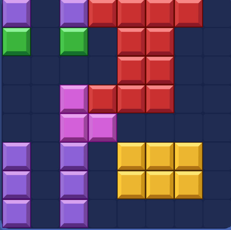 Fill complete rows or columns on the grid to clear them and earn points. Each turn gives you three shapes — all three must be placed before new ones appear. The game ends when no remaining shape can fit on the board.