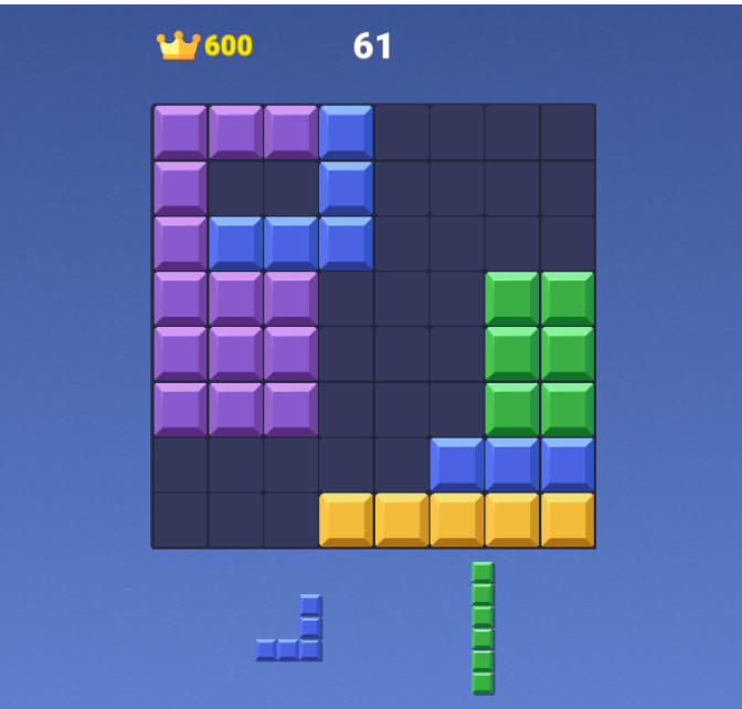 - -8x8 grid gameplay: Drag and drop colorful block shapes to fill and clear complete rows or columns.